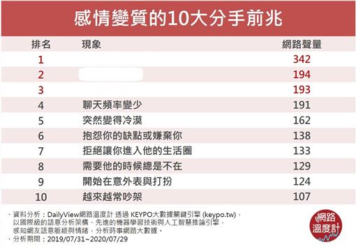 今天的DailyView網路溫度計透過《KEYPO大數據關鍵引擎》調查,蒐羅網友們那些讓人心碎的愛情故事,揭開每段感情面臨分手的結局前,最常出現的徵兆有哪些。