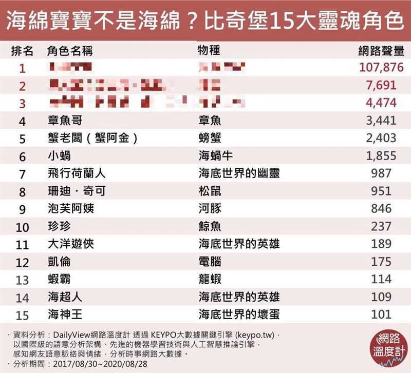 DailyView網路溫度計今日特別整理了5大隱藏版秘密,更透過《KEYPO大數據關鍵引擎》,針對「比奇堡」內所有靈魂角色進行調查,看看作者魔性畫筆下誰才是最高人氣!