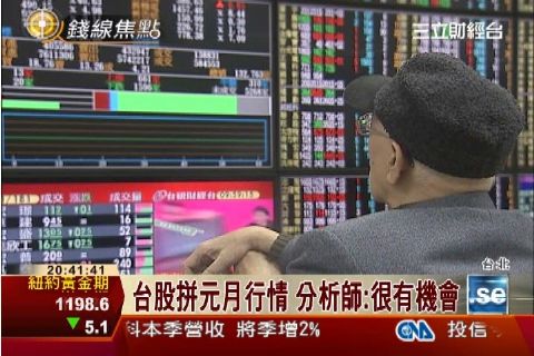 今年台股步入尾聲,明年元月到底有沒有紅包行情,股民都在期待,資深分析師儲祥生認為,台股終究看美股臉色,明年元月行情看來很有機會。資深分析師儲祥生表示:「12月底的時候美股還在創新高,看起來氣勢還在,美國股市明年第一季的狀況還好,那在這個大的前提之下,台股可能會跟著走的機會比較大。」