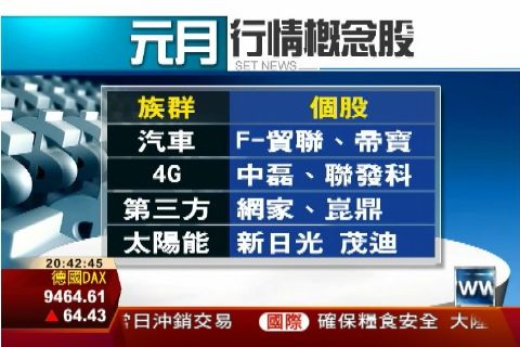 指著個股走勢,儲祥生強調,今年年初的強勢族群像是生技、3D列印股,到了12月反而開始回檔修正,因此佈局元月行情首選跌深的補漲股,除此之外,汽車、4G概念、第三方支付以及太陽能族群,也成為法人選股重點。