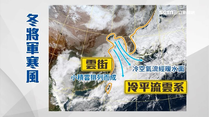 衛星雲圖看起來更驚人,有網友說看起來就像是冬將軍,把大口大口的冷風往台灣吹,氣象局長鄭明典解釋,這是冷空氣流經暖水面的特徵,密密麻麻的小積雲排列而成,又稱為雲街或是冷平流雲系 。
