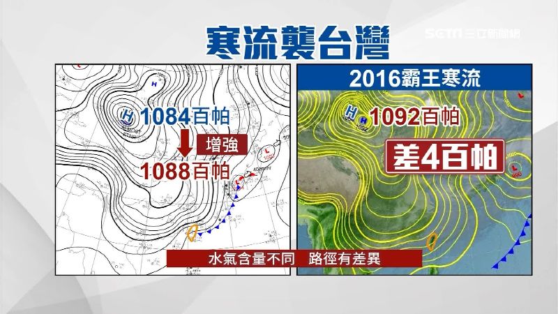 根據氣象局觀測,大陸冷高壓強度也從1084百帕增強到1088百帕,和2016年霸王寒流的1092百帕只差了4百帕,兩者的水氣含量不同行經路徑也有差異,但相同的是民眾出門要多注意保暖。