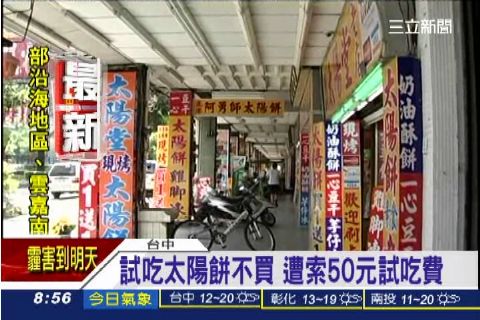 擔任室內設計師的陳姓女子,上個月底走進台中一家太陽餅店要求試吃,吳姓店員把三種餅各切一小塊給她試吃,但她覺得太甜、餅皮太硬,因此沒買就離開。之後到隔壁的餅店買了一盒太陽餅,經過時吳姓女店員看到竟衝出來,向她索討50元的試吃費。陳姓女子要店員開立註明「試吃費」的收據,而吳姓女店員則說是因為對方態度很差才堅持要收錢。