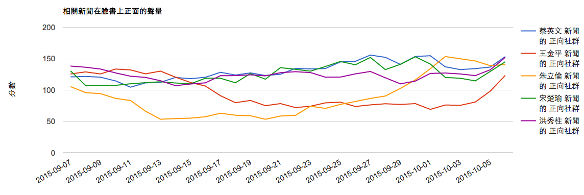 3.王金平最近都沒甚麼聲音,所以在09/13後就持續滑落,不只正面聲量減少,整個正負比原本是第一名的優勢完全不見,王金平在這兩天(10/05~10/06)朱倒柱失敗後,正面聲量又突然開始升高。