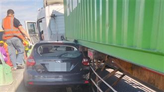 新/貨櫃車國道爆胎 轎車變「夾心餅乾」