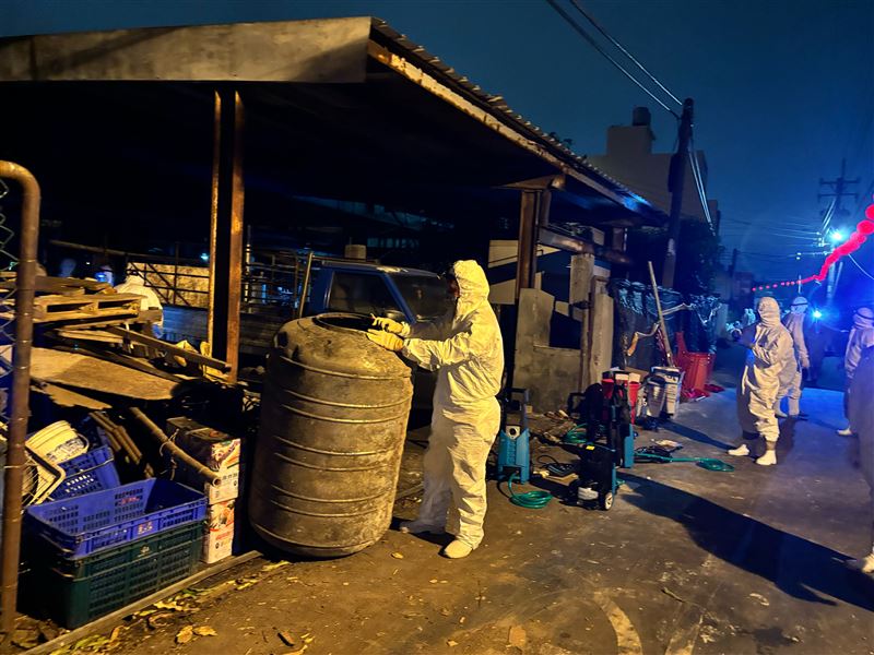 非洲豬瘟病毒頑強,中央派出國防化學兵連夜協助清理案例場。(圖/台中市政府提供)台中梧棲養豬場22日爆發非洲豬瘟首例,現場封鎖進行消毒,日前案場仍被驗出有病毒陽性,台中市府二度進行清消,還出動高溫火焰槍,不料中央30日宣布再度於案場兩處驗出病毒,且地點與上次不同,中央決定派出化學兵協助。30日晚間9點半陸軍第十軍團支援30位官兵,到現場清消,由於案場髒亂情況遠超預期,市府凌晨緊急連絡軍方再增援80名官兵,進行第二輪清理,等待現場清潔完成,35名化學兵即進駐消毒。