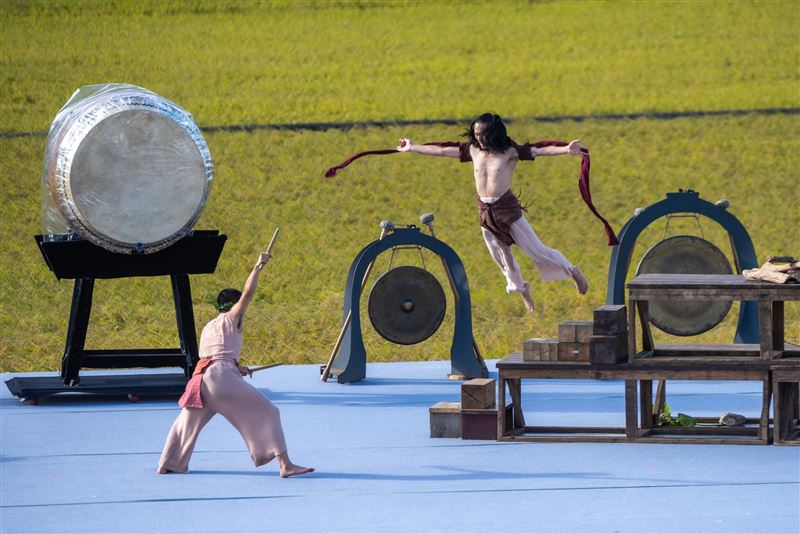 在金黃稻浪間,鼓聲、歌聲與風聲交織。優人神谷的肢體劇場與桑布伊的靈魂之歌《我回來了!》,將人與土地、天與地之間的關係重新串聯。他們以「回家」為題,象徵人心的歸返與自然的擁抱,訴說著花蓮人從災後走回希望的旅程。這不僅是一場表演,更像是一場祈禱——為大地、為生命、也為記憶中的家鄉。